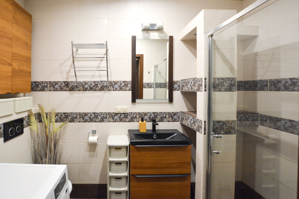 Łazienka z kabiną natryskową, umywalką. W korytarzu szafa w zabudowie Komandor.