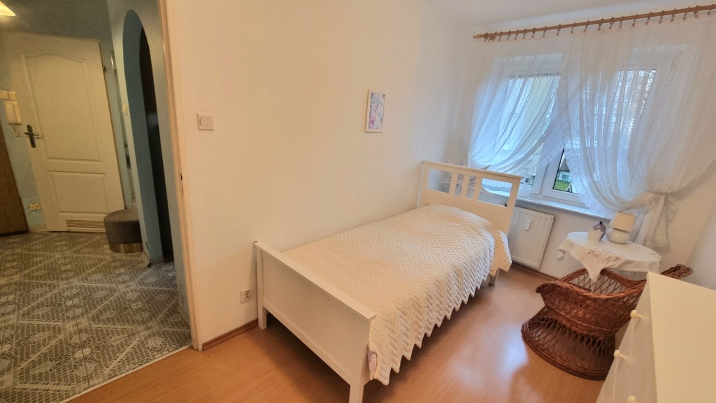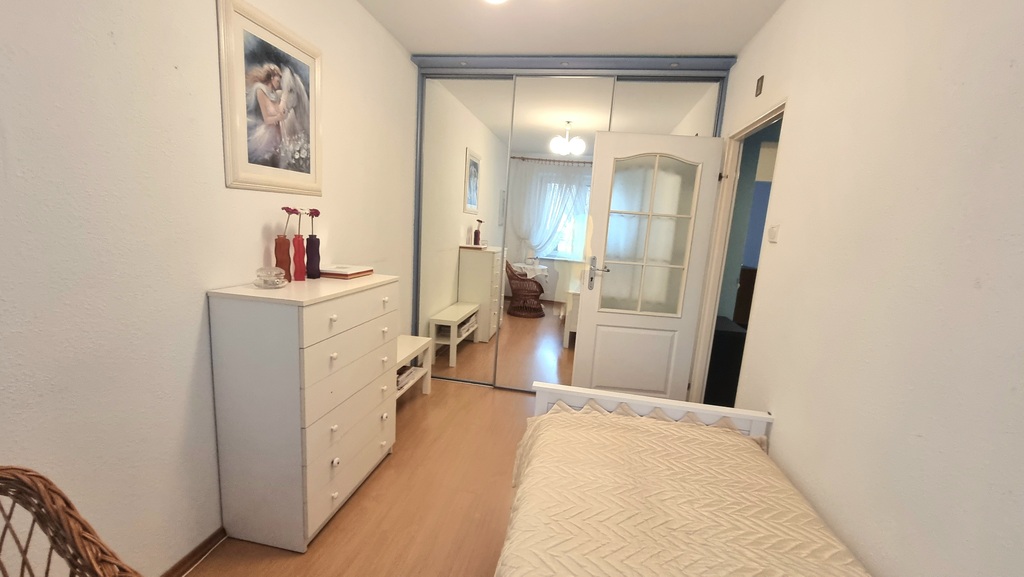 - Sypialnia: Przytulna, wyposażona w łóżko oraz pojemną, lustrzaną szafę typu Komandor, zapewniającą doskonałą organizację garderoby.
