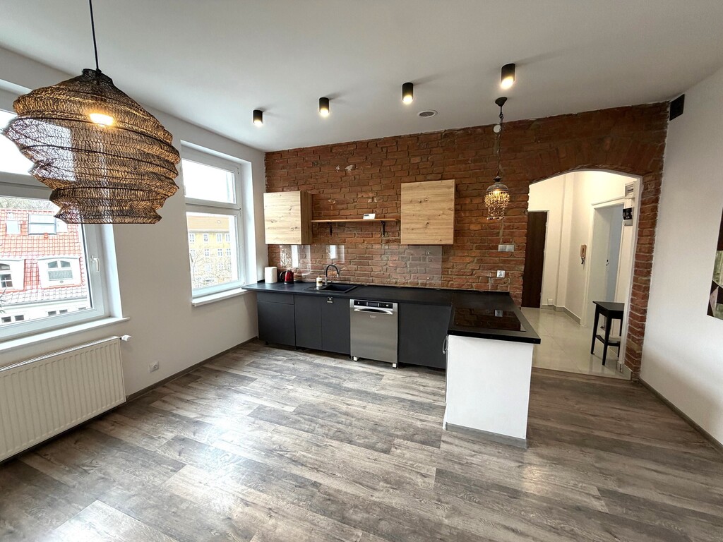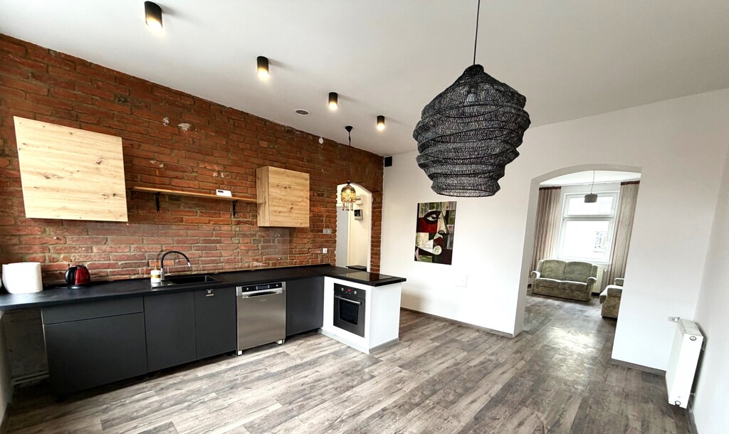 ? kominek w salonie i cegła w kuchni ? wyjątkowy klimat kamienicy