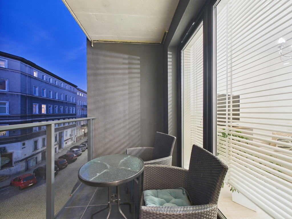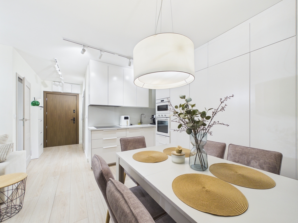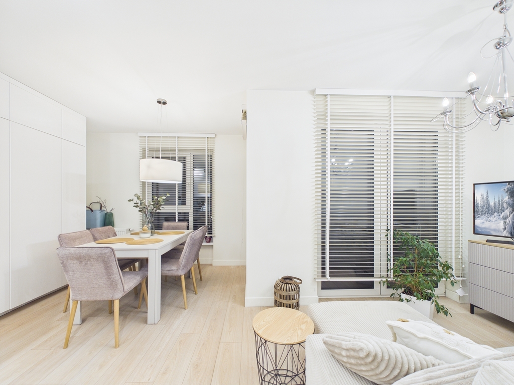 - salon z aneksem kuchennym oraz wyjściem na balkon,