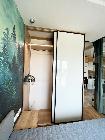 * Sypialnia oddzielona od salonu ścianą z mocnego, hartowanego szkła, którą wedle upodobania można zupełnie zasłonić lub otworzyć na salon. W zabudowie również duża podświetlana szafa z drzwiami przesuwnymi.