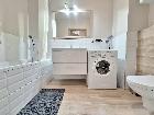 - gustowna łazienka z wanną, dużym lustrem, WC i pralką,