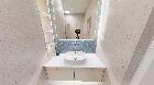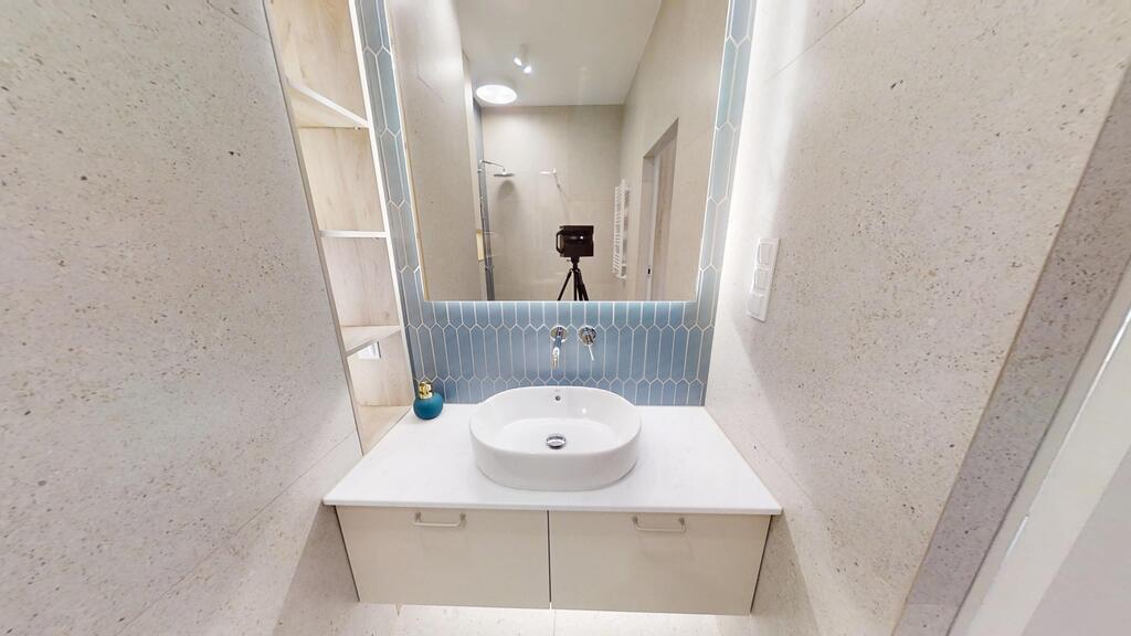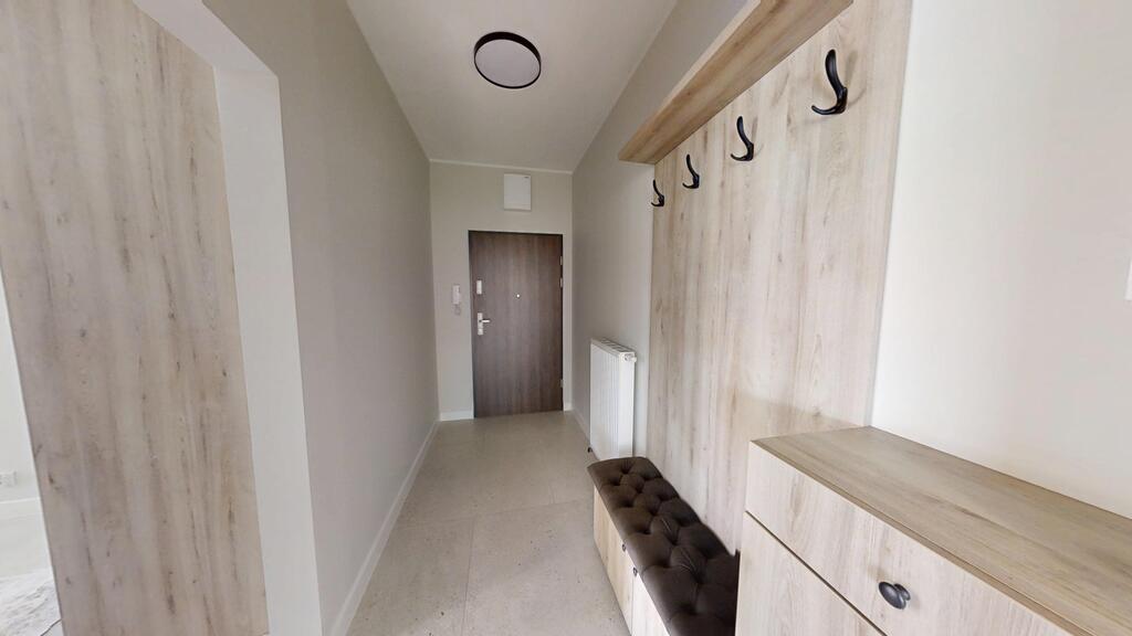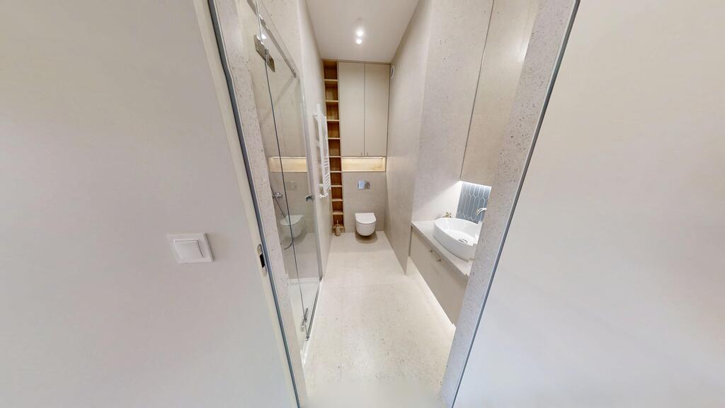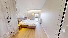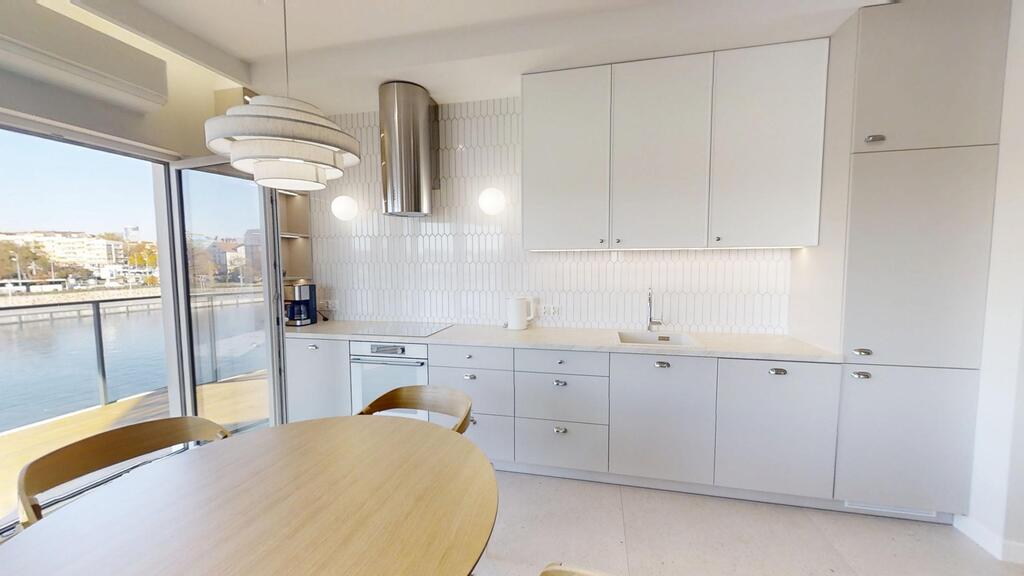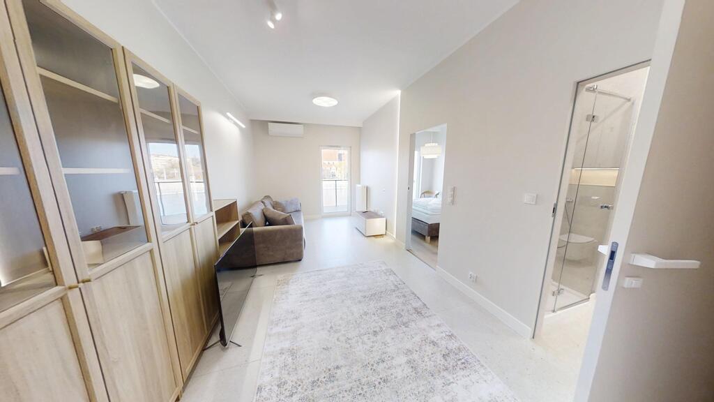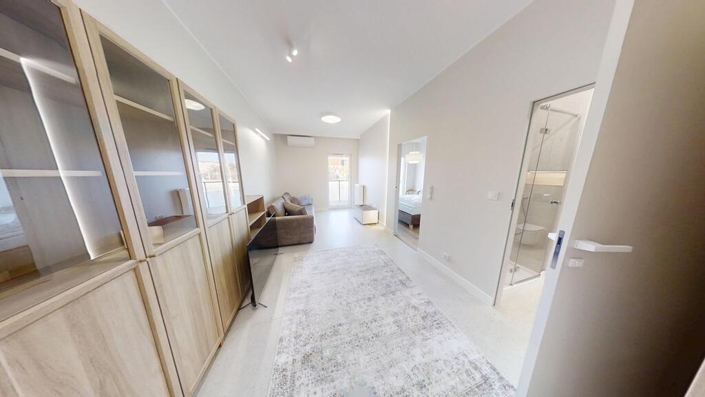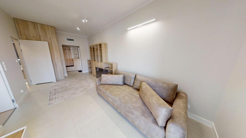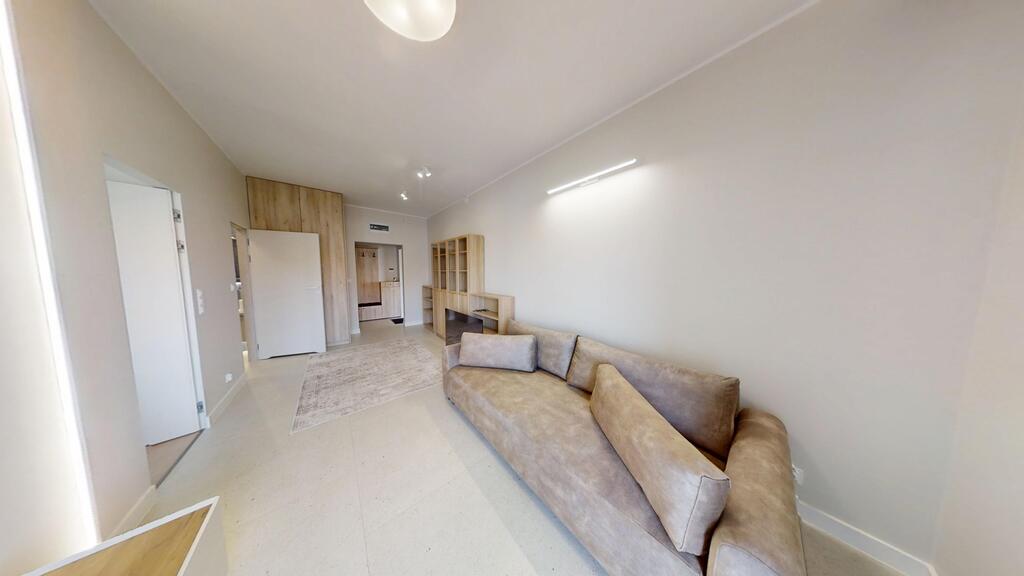 - Przestronny salon z aneksem kuchennym ? centralna część apartamentu, z panoramicznymi oknami, wyjściem na loggię i imponującym widokiem na miasto. Strefa wypoczynkowa wyposażona w zabudowę RTV , oświetlenie LED oraz system nagłośnienia.