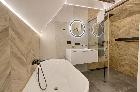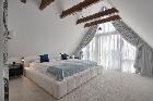 Na górnym poziomie sypialnia z łóżkiem i szafami w zabudowie, łazienka z wanną i kabiną prysznicową.