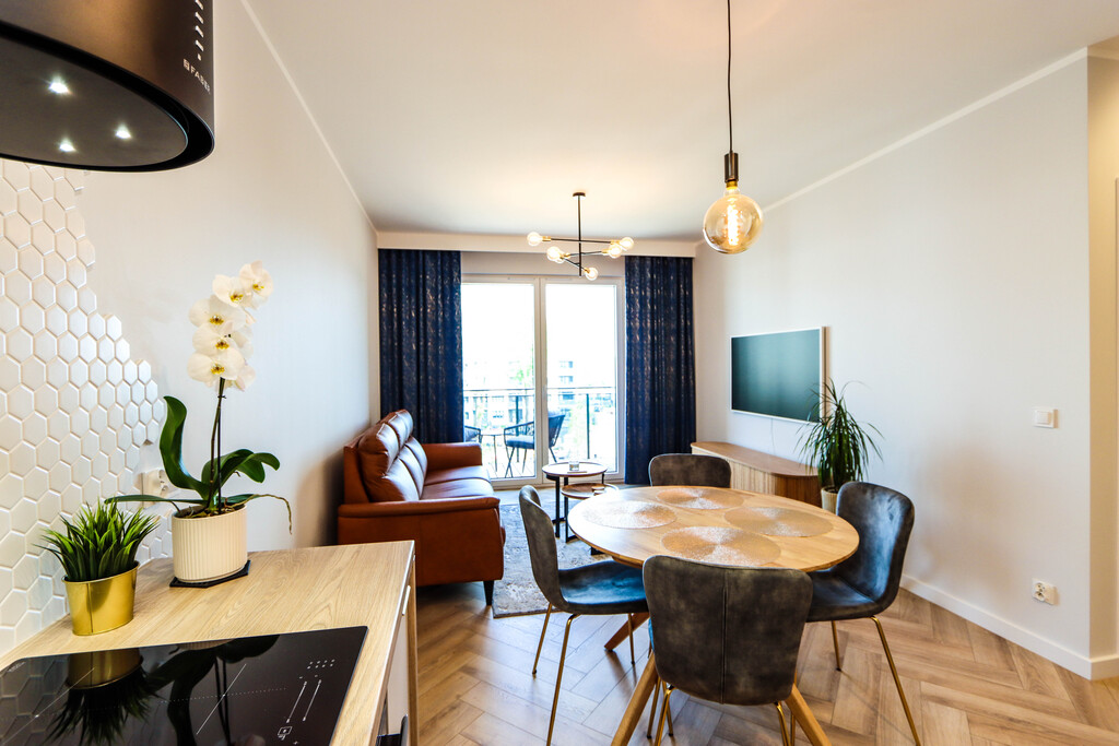 - Kuchnia w formie aneksu, wyposażona w wysokiej klasy sprzęt AGD,