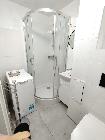 Niewielka łazienka - kabina prysznicowa, umywalka, toaleta i pralka.