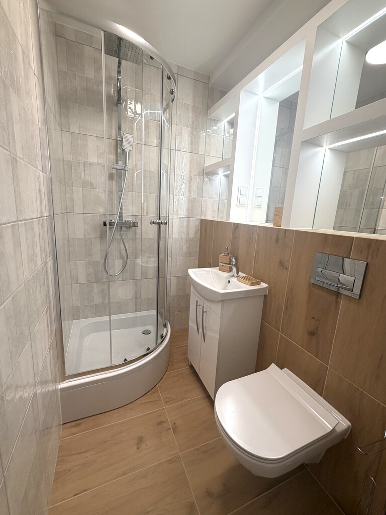 Kuchnia wykonana na wymiar i wyposażona w nowoczesny sprzęt AGD, w tym kuchenkę gazową. Łazienka oraz całe mieszkanie świeżo wykończone, a klimatyczne oświetlenie LED tworzy przyjemny nastrój.