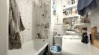 Łazienka z toaletą w glazurze i terakocie (pralka). Kuchnia w kafelkach, wyposażona w lodówkę oraz kuchenkę, szafki kuchenne.