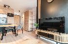 Mieszkanie posiada część dzienną z aneksem kuchennym, stołem do spożywania posiłków oraz z częścią na odpoczynek przed TV. Do tego za ścianką wydzielona część sypialniana z szafą i półkami na przechowywanie rzeczy. Meble w zabudowie z lodówką, zmywarką, okapem, płytą grzewczą, piekarnikiem i mikrofalówką. W szufladach dostępne talerze, sztućce itp. Na wyposażeniu pozostaje również żelazko, deska do prasowania, odkurzacz
