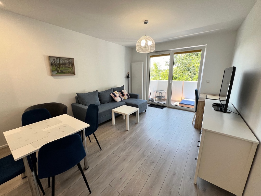 Mieszkania składa się z salonu z aneksem kuchennym, dwóch sypialni, przedpokoju, łazienka z WC oraz osobne WC. Mieszkanie w pełni umeblowane.