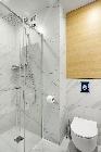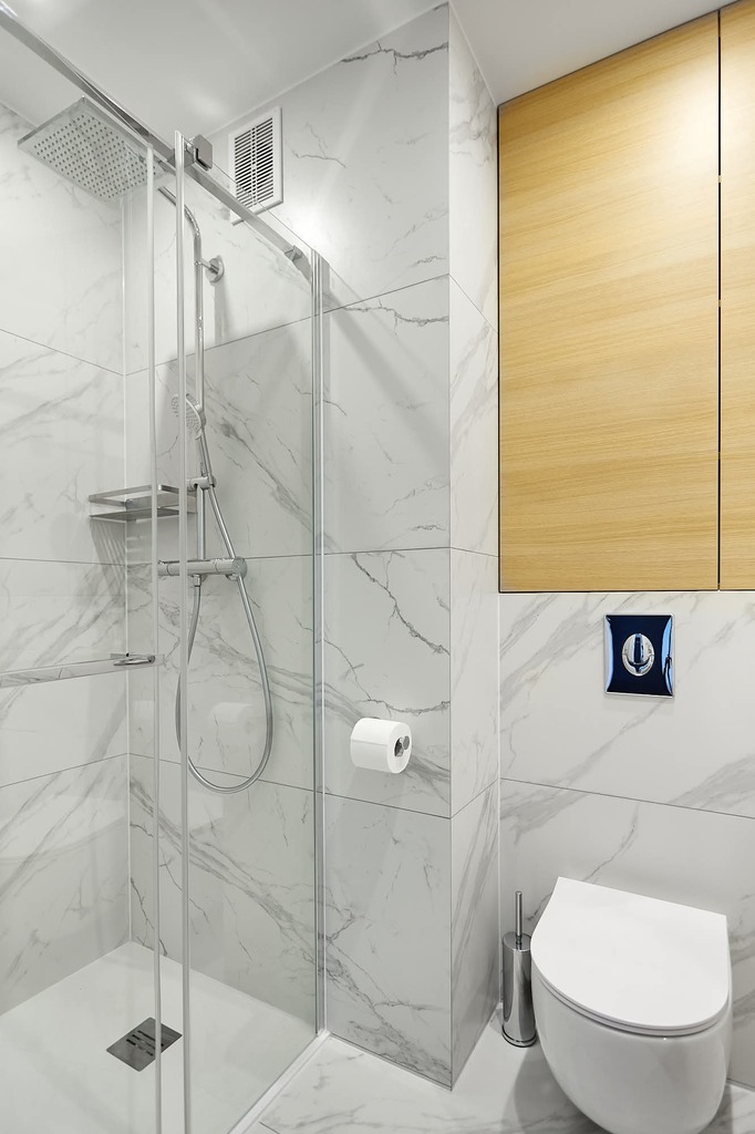- łazienka z prysznicem i pojemną zabudową meblową