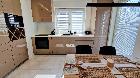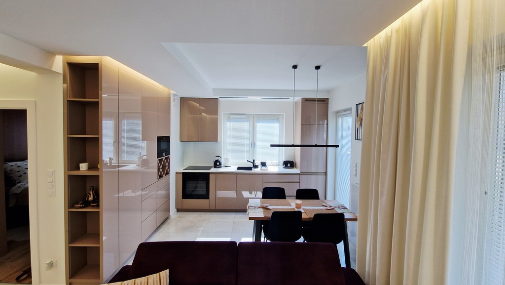 - salon z w pełni wyposażonym aneksem i szafami w zabudowie