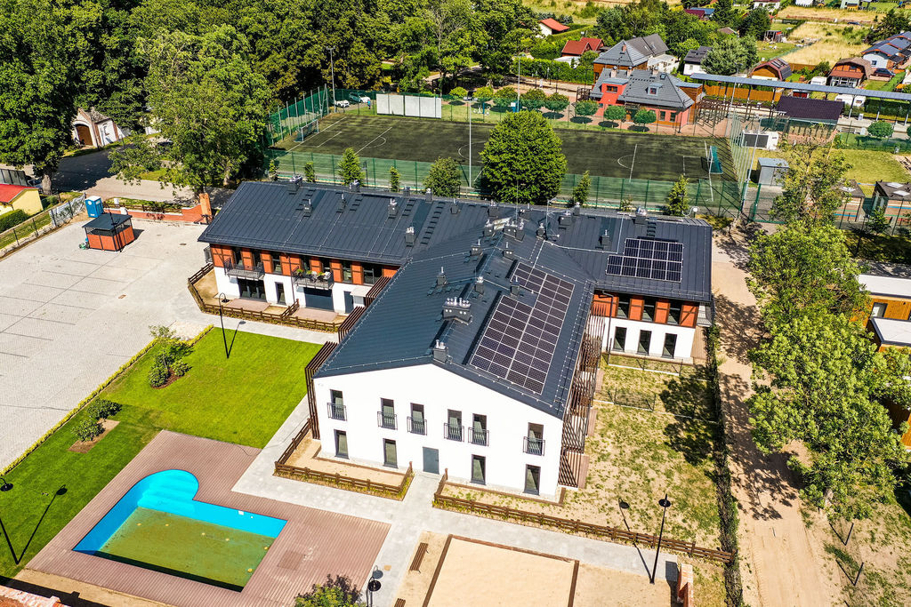 Wykorzystanie odnawialnych źródeł energii- panele fotowoltaiczne na dachu oraz basen podgrzewany pompą ciepła,