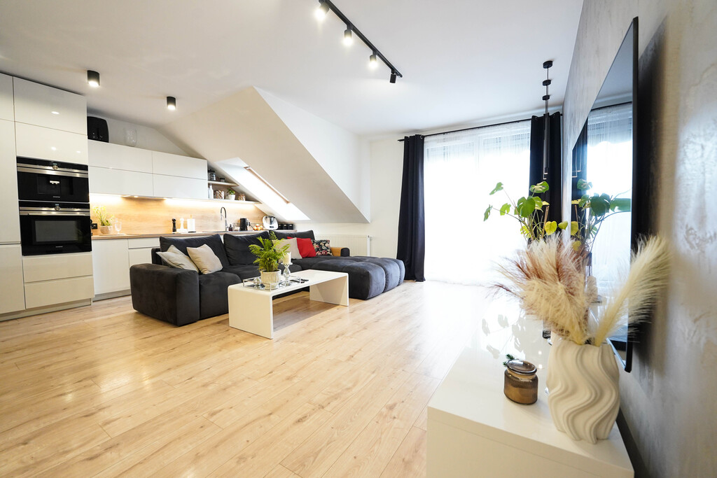 - salon z aneksem oraz wyjściem na balkon