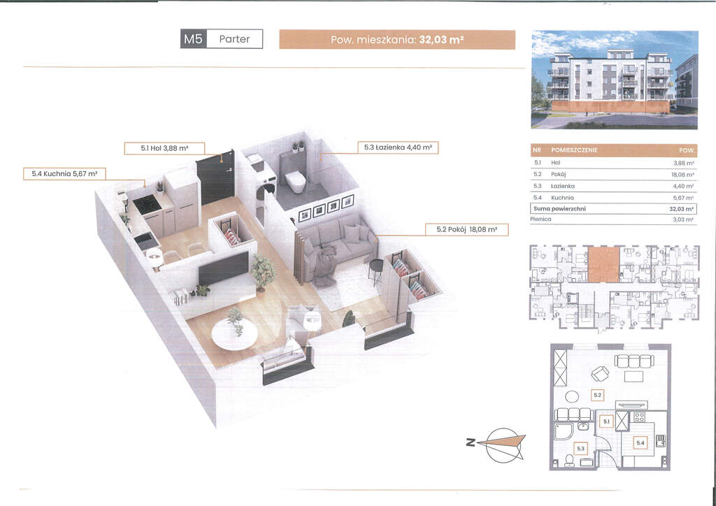 Przedmiotowe mieszkanie znajduje się na parterze. Składa się z pokoju o powierzchni 18,08mkw, łazienki 4,40mkw, kuchni 5,67mkw oraz hallu 3,88mkw. Do mieszkania przynależy piwnica o powierzchni 3,03mkw.
