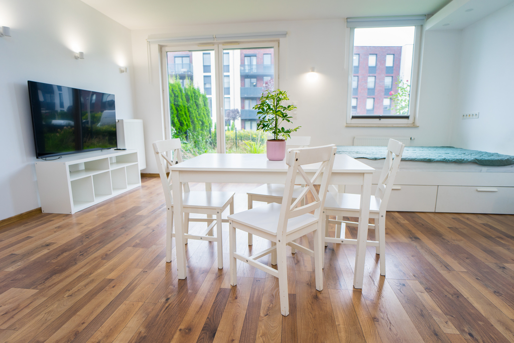 Nieruchomość o funkcjonalnym rozkładzie pomieszczeń, (przearanżowana z dwupokojowego mieszkania w otwartą formę) z oddzielną kuchnią, ogrodem i miejscem na taras.